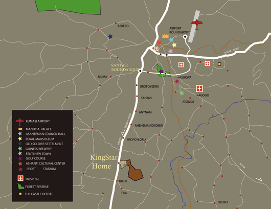 Kumasi is the hub of Ghana, with transport links to the whole of West Africa. There are currently 6 flights a day from Kumasi to Accra. Future infrastructure currently in progress includes a new Ring Road around Kumasi which will link it with Accra and other major cities.